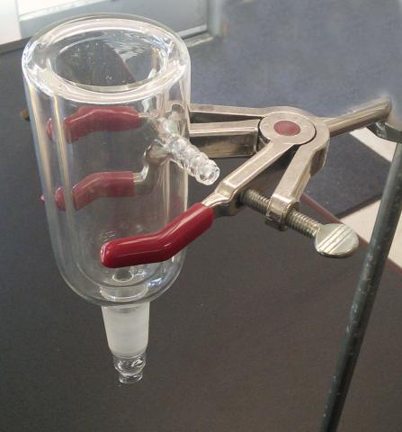 Filtration erfolgt direkt in Reaktionsgefäß durch Schliffverbindung 24/40, wodurch umständliches Umgießen vermieden wird. Zum Aufsatz des Filters ist entweder ein Filterring oder Konus erforderlich. Maße: Gesamtlänge 16 cm, Außenweite 6,5 cm, lichte Weite 5, 0 cm, Durchlaßweite 8 mm. Material Borsilikatglas.
