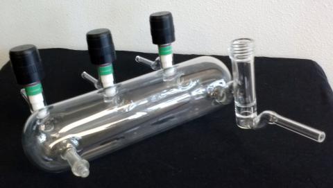 Die gezeigte Vakuumleitung mit mit drei Anschlußhähnen, sowie einem Absperrhahn vor der Pumpe hat einen Rauminhalt von 1 l und kann daher sowohl ihrem Namenszwecke gemäß als Vakuumleitung zwischen Reaktionskolben und Vakuumpumpe verwendet werden, als auch als Ersatz für einen Windkessel zur Abmessung im Labor üblicherweise gebrauchter Gasvolumina zur Verwendung kommen. Durch die Vakuumhähne kann ein statischer Vakuumsbezirk geschaffen werden. Verbindung zur Pumpe wahlweise mit Kugel- oder Kegelschliff.