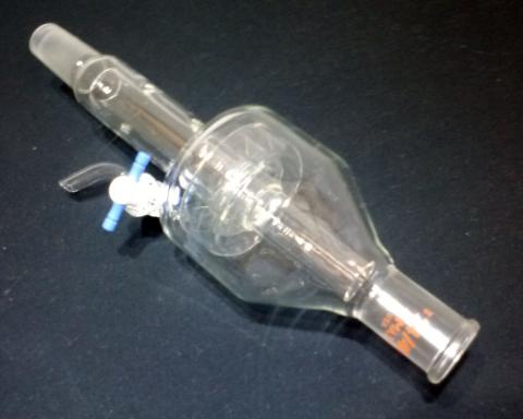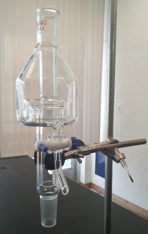 Geeignet zur Wasserabscheidung mit Schleppern sowohl größerer als auch kleinerer Dichte als der des Wassers (Zyklohexan, Benzol, Chloroform, usw.). Kann mit Luftkühler zur Wassereinsparung eingestetzt werden. Die Ausführung ist kompakt und kolbenmittig, was das lästige Anstoßen an wegstehenden Teilen der Apparatur bei der Erledigung anderer Arbeiten im Abzug vermeiden hilft, wie es u.a. beim Wasserabscheidertyp Dean-Stark vorkommen kann.